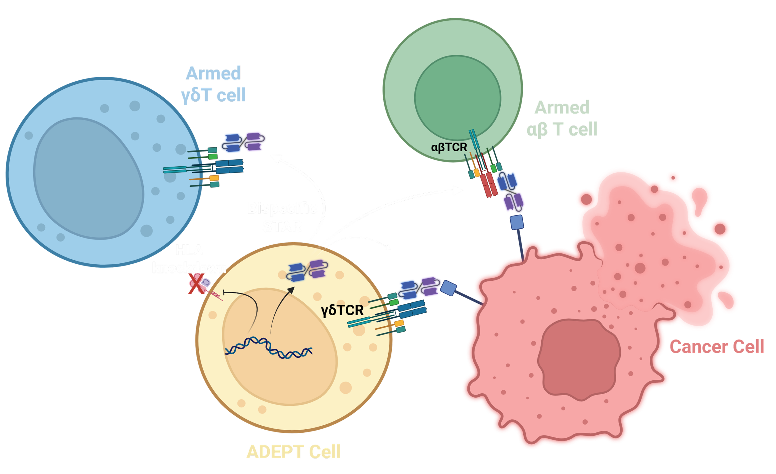 We are developing a best-in-class cell therapy utilizing autologous (i.e. patient) derived, expanded, and programmed γδT cells (‘ADEPT’) to deliver a secreted T cell engager (TCE) targeting SSTR2 as the surface tumor antigen and capable of engaging all CD3+ cells in the cell product as well as the patient’s endogenous T cells.